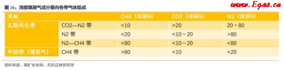在接近地表的煤層內(nèi),原生的天然氣向上運(yùn)移,離開(kāi)煤層,地面空氣和地表的生物化學(xué)和化學(xué)反應(yīng)所產(chǎn)生的氣體向下滲透,進(jìn)入煤層,從而淺部煤層氣成分形成垂向分帶現(xiàn)象。一般自上而下可分為四個(gè)帶:二氧化碳—氮?dú)鈳?,氮?dú)鈳В獨(dú)?mdash;甲烷帶,甲烷帶。采煤界將前三個(gè)帶統(tǒng)稱為"瓦斯風(fēng)化帶",在"瓦斯風(fēng)化帶"下的"甲烷帶"才是煤層氣的主要開(kāi)采區(qū)域。具體如下表所示: