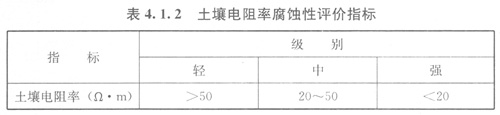 4.1.2在土壤層未遭到破壞的地區(qū),可采用土壤電阻率指標(biāo)判定土壤腐蝕性。土壤電阻率腐蝕性評(píng)價(jià)指標(biāo)應(yīng)符合表4.1.2的規(guī)定。
