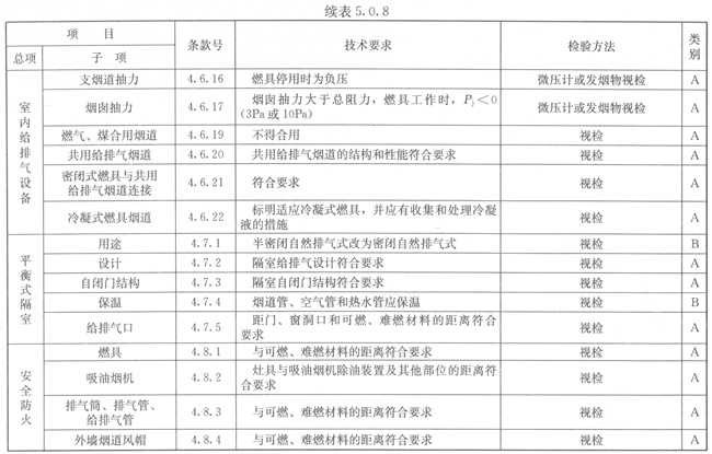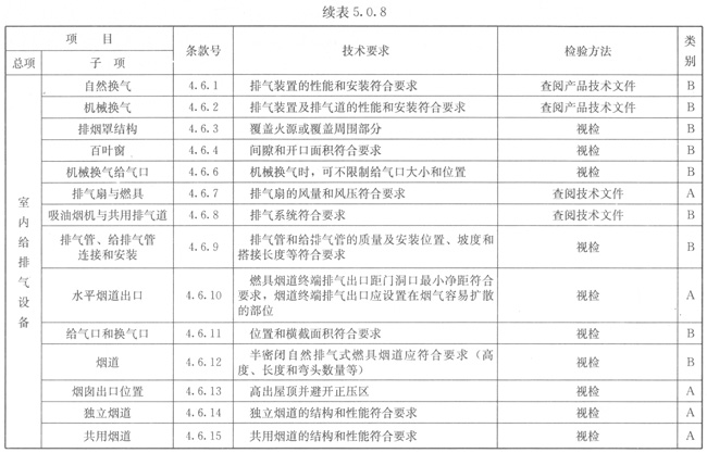 5.0.6燃具檢查項目及性能要求應符合本規(guī)程表5.0.7~表5.0.8的規(guī)定。類別A為主控項目應全檢,B為一般項目應抽檢。抽檢比例不應小于20%,且不應少于2臺。上述檢查合格和用戶簽字后張貼合格標示。