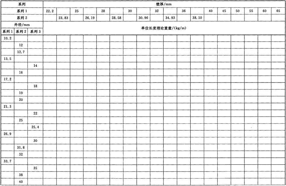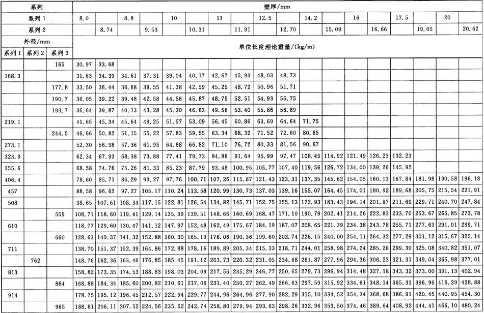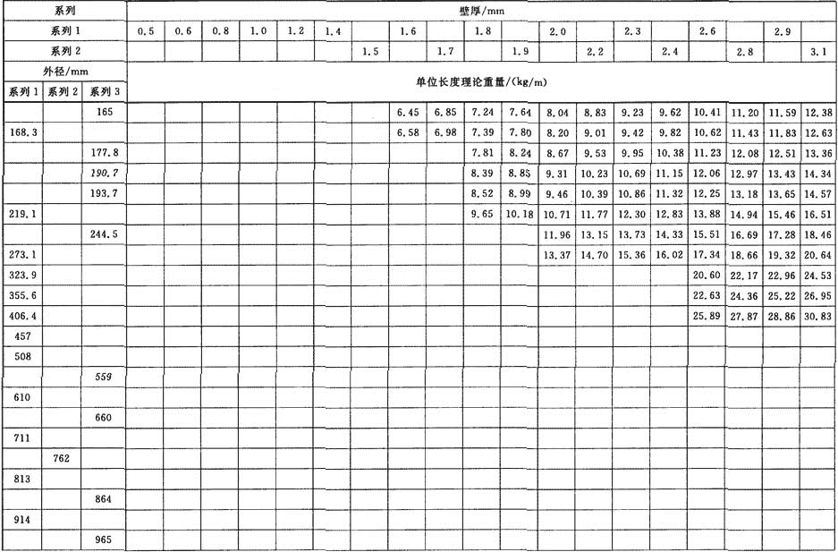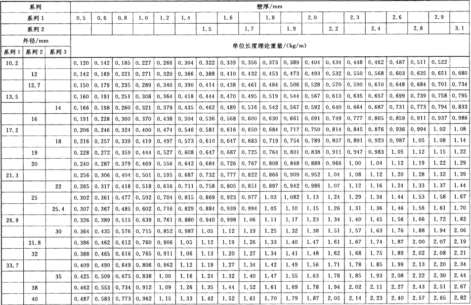 普通焊接鋼管和精密焊接鋼管單位長(zhǎng)度理論重量按式(1)計(jì)算(鋼的密度取7.85kg/dm3),其計(jì)算值分別列于表1和表2。