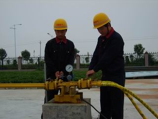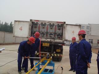 (圖三)運輸壓縮天然氣的槽車到站區(qū)就位。卸車前關閉CNG站內(nèi)及卸車柱上所有閥門,操作人員必須使用防爆工具。