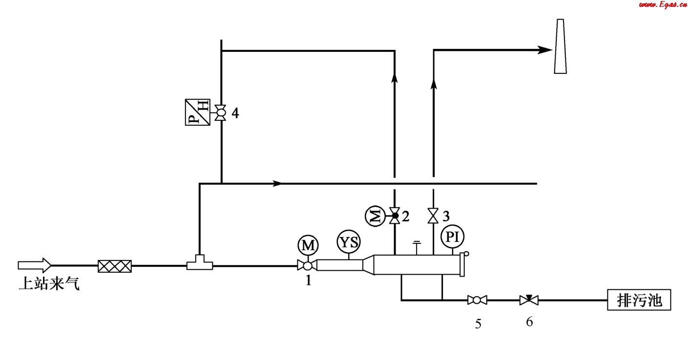 清管站的功能就是收發(fā)清管器。長輸管道的清管作業(yè)有投產(chǎn)前清管和正常運(yùn)行期間清管。投產(chǎn)前清管的主要目的是清除管道內(nèi)雜質(zhì),主要包括施工期間的泥土、焊渣、水等。正常運(yùn)行期間的清管是指管道運(yùn)行一段時間后,由于氣體內(nèi)含有一定的雜質(zhì)積存在管線內(nèi),使管輸效率下降,對管線造成腐蝕等,因此需要對管線進(jìn)行清管。常見清管站工藝流程圖,如圖3-1所示。