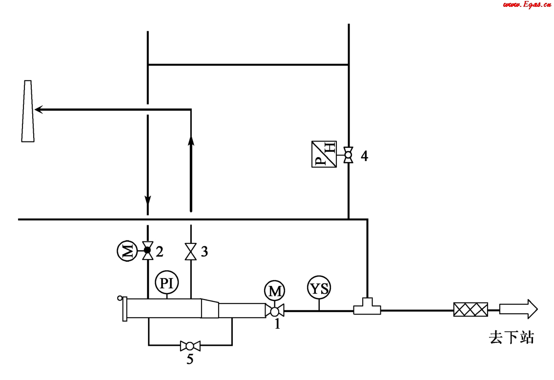 (12)觀察清管器通過指示器YS,確認(rèn)清管器發(fā)出后,打開出站閥4,關(guān)閉閥2、閥1。