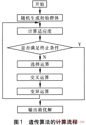 遺傳算法作為一種全局優(yōu)化搜索方法,以其簡單通用、魯棒性強、適于并行處理以及應(yīng)用范圍廣等特點,在求解復(fù)雜的工程優(yōu)化問題中取得了良好的效果。它是基于生物進化的思想,將優(yōu)化計算中的迭代過程模擬成物種進化的過程,形成一種具有“生成+檢驗”特征的搜索算法[5]。它以編碼空間代替問題的參數(shù)空間,以適應(yīng)度函數(shù)為評價依據(jù),以編碼群體為進化基礎(chǔ),以對群體中個體位串的遺傳操作實現(xiàn)選擇和遺傳機制,建立起一個迭代過程,使遺傳算法具有了其他傳統(tǒng)優(yōu)化方法所沒有的特性。遺傳算法的計算流程見圖1。