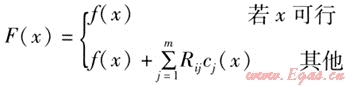 遺傳算法用于求解約束非線性最優(yōu)化問題,最常用的方法是懲罰函數(shù)法,其本質(zhì)是通過懲罰不可行解,把有約束的問題轉(zhuǎn)化為無約束問題。目前常用的懲罰函數(shù)法有:靜態(tài)懲罰函數(shù)法、動態(tài)懲罰函數(shù)法、退火懲罰函數(shù)法等[6],本中采用靜態(tài)懲罰函數(shù)法[7]。這種方法對每個約束設(shè)定了三個違約水平,對每個違約水平和每個約束產(chǎn)生一個懲罰因子,違約水平越高,懲罰因子Rij(i=1,2,…,L;j=1,2,…,m)越大。Rij確定后,在算法的演化過程中是不變的??紤]了懲罰因子后的新適應(yīng)度F(x)的表達式為: