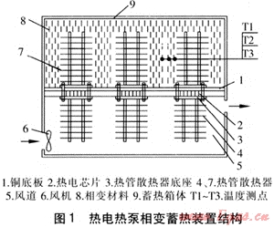 熱電熱泵以消耗一部分電能為代價,把環(huán)境介質如水、空氣等儲存的熱量從溫度低的一端(冷端)移到溫度高的一端(熱端)。根據(jù)熱電制熱原理,在熱電熱泵冷熱端溫差較小時,特別是當冷端溫度高于熱端溫度時,熱電熱泵的制熱性能系數(shù)相應提高。熱電熱泵相變蓄熱裝置的結構見圖1。