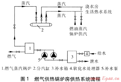 該酒店裙樓地下共有3層,其中地下一層的原發(fā)電機(jī)組儲(chǔ)油庫(kù)現(xiàn)已停止使用,建筑面積約60m2,緊鄰地下一層出口坡道,距燃?xì)膺M(jìn)戶管道8m,經(jīng)改造后,可作為燃?xì)夤徨仩t房。燃?xì)夤徨仩t房供熱系統(tǒng)流程見(jiàn)圖1。