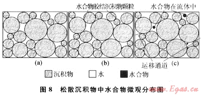 水合物的微觀分布對(duì)沉積物內(nèi)氣體運(yùn)移通道具有重要影響:在固結(jié)沉積物中,水合物在飽和度大于30%后膠結(jié)沉積物顆粒,使沉積孔隙中部分流體被“封閉”,得不到氣源的供給而不能進(jìn)一步生成水合物;而在松散沉積物中,大部分水合物因在孔隙流體中生成(只有最初1%飽和度的水合物膠結(jié)沉積物顆粒),未堵塞流體運(yùn)移通道,因此水合物幾乎能完全充填孔隙。