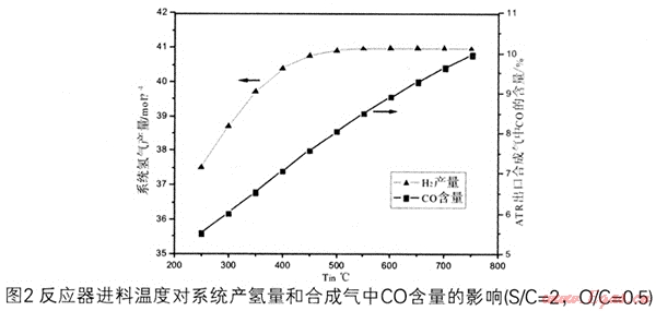 SIC=2,O/C=0.5時(shí),進(jìn)料溫度對(duì)氫氣產(chǎn)量及合成氣中CO含量的影響如圖4所示。隨著進(jìn)料溫度Tin的增大,蒸汽重整反應(yīng)的平衡轉(zhuǎn)化率提高,系統(tǒng)產(chǎn)氫量有所增加,但是同時(shí),也產(chǎn)生了更多的CO,這樣就會(huì)增加下游合成氣凈化系統(tǒng)的負(fù)荷。當(dāng)Tin<500℃時(shí),隨著Tin的增大,氫氣產(chǎn)量增加的幅度較大,當(dāng)Tin>500℃時(shí),氫氣產(chǎn)量的增加趨勢(shì)趨于平緩:ATR出口混合氣中CO的含量與Tin基本呈線性增加。對(duì)于整個(gè)系統(tǒng)而言,隨著Tin的增大,系統(tǒng)的能耗也將增大(燃燒的天然氣增多)。從圖2可以確定,在所研究的操作條件下,Tin較為合理的范圍是450~500℃。