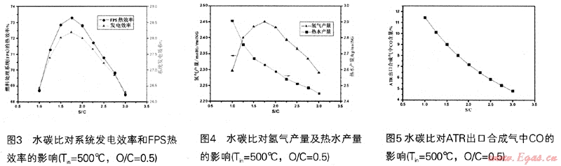 對(duì)于整個(gè)系統(tǒng)來說,水碳比是重要的操作參數(shù),對(duì)系統(tǒng)的效率會(huì)產(chǎn)生重要的影響。高水碳比可以防止重整催化劑上積碳的產(chǎn)生,有利于重整反應(yīng)向產(chǎn)物方向進(jìn)行,從而提高氫氣的產(chǎn)率,但是高水碳比會(huì)導(dǎo)致整個(gè)系統(tǒng)的能耗較大,需要很多額外的能量來產(chǎn)生高溫蒸汽,因而可能會(huì)降低燃料處理系統(tǒng)的熱效率。所以要從系統(tǒng)效率的角度去考慮合適的水碳比。圖3-5顯示了自熱重整進(jìn)料溫度為500℃,氧碳比為O.5時(shí),水碳比對(duì)發(fā)電效率、燃料處理系統(tǒng)(FPS)熱效率,氫氣產(chǎn)量(molH2/molNG)、系統(tǒng)熱水產(chǎn)量(kg/molNG)DATR出口合成氣中CO含量的影響。