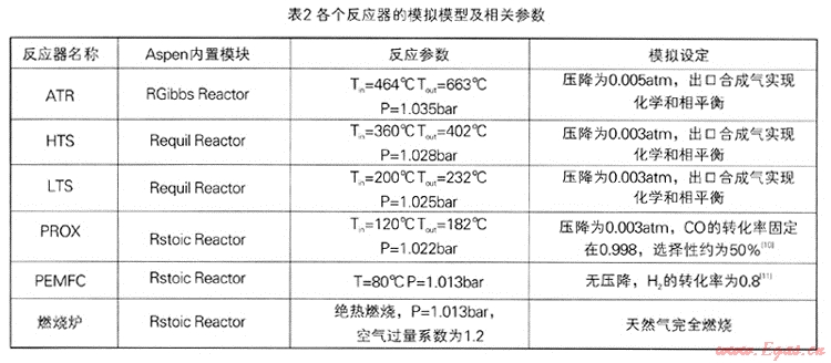 ATR,HTS,LTS和PROX反應(yīng)器在模擬過程中處理為絕熱系統(tǒng),ATR,HTS,LTS反應(yīng)器出口的合成氣處于出口溫度下的化學(xué)平衡狀態(tài),出口溫度由入口物流溫度及絕熱溫升決定。表2列舉了各個(gè)反應(yīng)器在模擬過程中Aspen內(nèi)置的模塊及相關(guān)的參數(shù)。