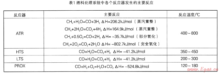 燃料處理系統(tǒng)主要包括天然氣自熱重整制氫反應(yīng)器(ATR),高低溫水汽變換反應(yīng)器(HTS,LTS),CO優(yōu)先氧化反應(yīng)器(PROX),該系統(tǒng)主要為燃料電池提供CO含量低于10ppm的富氫氣體。自熱重整反應(yīng)得到富氫混合氣(30%~38%H2),經(jīng)高溫變換后,混合氣中CO的含量降低到2.0%~4.O%,再經(jīng)過低溫變換使CO的含量降到O.4%~O.9%,最后進(jìn)入PROX,使混合氣中的CO含量降到1Oppm以下,供給到PEM燃料電池。表1中列舉了燃料處理系統(tǒng)中各個(gè)反應(yīng)器中發(fā)生的主要反應(yīng)[7]。