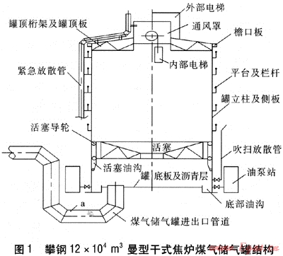 攀鋼12×104m3曼型干式焦爐煤氣儲氣罐采用單管布置(進、出氣共用一根管道),主要結(jié)構(gòu)見圖1。