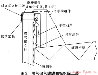② 煤氣儲氣罐側(cè)板拆除過程中,罐頂作為施工平臺在下降過程中,應統(tǒng)一指揮,同步操作,確保手拉葫蘆的同步性;鳥形鉤及立柱工裝的固定一定要作好安裝質(zhì)量檢查,確保安全使用。