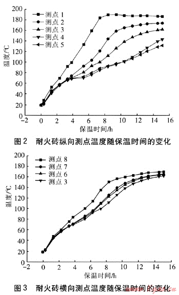 干燥窯內(nèi)耐火磚縱向測點(diǎn)和橫向測點(diǎn)的溫度隨保溫時(shí)間的變化分別見圖2和圖3。