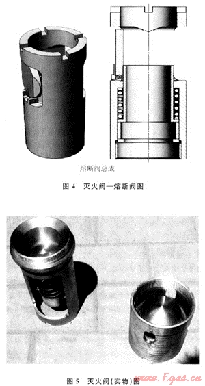 滅火閥其實是一個特殊的鉆柱浮閥。氣體鉆井中,在鉆頭上部都安裝有安全裝置——浮閥(單向閥),可以防止環(huán)空中的壓縮空氣(或其他氣體)和攜帶的巖屑回流進(jìn)鉆柱內(nèi)。這種閥裝有一個活瓣機(jī)構(gòu),循環(huán)停止時環(huán)空中的壓縮空氣和巖屑將會回流,回流推動活瓣關(guān)閉,反過來阻止回流。把浮閥經(jīng)過改進(jìn),在其上部設(shè)計一個低熔點合金制造的閥件(采用鋅環(huán)),加工形成了由單向閥總成和熔斷閥總成兩部分組成的滅火閥[4](見圖3、4、5)。在正常情況下,循環(huán)的空氣流動壓力使彈簧瓣向下張開,允許空氣循環(huán)通過。一旦環(huán)空著火,溫度上升,當(dāng)超過設(shè)計溫度時,低熔點合金鋅環(huán)熔化使襯套封住空氣流道,關(guān)閉閥門,停止向井底循環(huán)補(bǔ)充空氣,從而切斷氣源使火熄滅[5]。