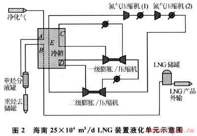 海南LNG工廠屬于小型的天然氣液化裝置,從工程投資、運(yùn)行費(fèi)用、裝置流程的簡(jiǎn)便性、運(yùn)行的靈活性、設(shè)備的數(shù)量等方面考慮,選擇改進(jìn)的氮?dú)馀蛎浿评涔に?mdash;—氮?dú)舛?jí)膨脹制冷工藝。