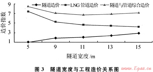 隧道橫斷面尺寸與LNG卸料管道U形膨脹彎的尺寸、數(shù)量的關(guān)系如下:膨脹彎的垂臂長(zhǎng)度越小,則隧道內(nèi)LNG管道的膨脹彎數(shù)量越多,隧道橫斷面尺寸較小,低溫管道的費(fèi)用則越高,隧道工程的造價(jià)越低;反之則相反。綜合比選結(jié)果參見(jiàn)圖3。