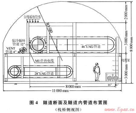 隧道內(nèi)包括管道區(qū)域和人員通道兩大區(qū)域。其中工藝管線包括46″(1168.4mm)的LNG卸料管道、28″(711.2 mm)的BOG回氣管道、12″(304.8mm)的保冷循環(huán)管道和4″(101.6mm)的排氣(VENT)管道,公用系統(tǒng)管道包括16″(406.4mm)的消防海水管道及其他小口徑的氮?dú)狻x表風(fēng)、水管道及儀表電纜、電力電纜(參見(jiàn)圖4)。低溫管道均采用焊接連接,不設(shè)任何閥門或法蘭。此外,作為防冷凍保障方案,在LNG卸料管道底部的管架上,設(shè)置M1電纜進(jìn)行電伴熱,用于隧道通風(fēng)換熱不足情況下的安全保障,其設(shè)計(jì)能力為18.0W/m。