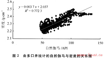 對(duì)未擴(kuò)徑處的自然伽馬與密度進(jìn)行相關(guān)分析,根據(jù)圖2的關(guān)系式,通過自然伽馬求取密度值。