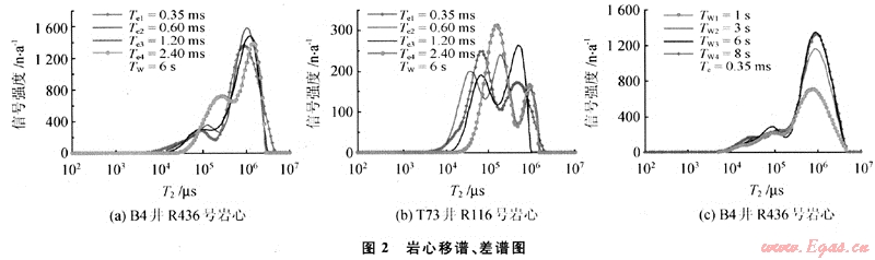 飛仙關(guān)組15塊巖心的差譜實驗結(jié)果表明,不同等待時間條件下測量的T2譜形狀基本相似,呈雙峰特征,長弛豫組分的(大孔徑孔隙)信號幅度隨等待時間的增加而增大(圖2-c),表明可以探測到大孔隙中更多的氫核,等待時間越長,大孔徑孔隙中的流體極化程度越高。也就是說大孔徑孔隙中的流體需要較長的等待時間才能得到充分極化,但短弛豫組分的(小孔徑孔隙)信號幅度在不同的等待時間下變化不大,表明小孔徑孔隙在較短的時間內(nèi)氫核就能得到充分極化。圖2-c中:Tw等于6s和8s時,兩弛豫譜線基本重疊,表明當(dāng)?shù)却龝r間超過6s時,大孔徑中的氫核達(dá)到完全極化。在6s以內(nèi)的等待時間,大孔徑中的氫核不能完全極化,故T2譜幅度較小,隨著T2的增大,極化程度增大,T2譜幅度增加,因此出現(xiàn)大的差譜信號。