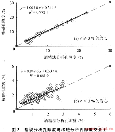 4口井的277塊巖樣的核磁實驗表明:對于較高孔隙度的樣品核磁可準(zhǔn)確地計算孔隙度、滲透率,而孔隙度較低的樣品,核磁計算的孔、滲參數(shù)誤差很大(圖3)。