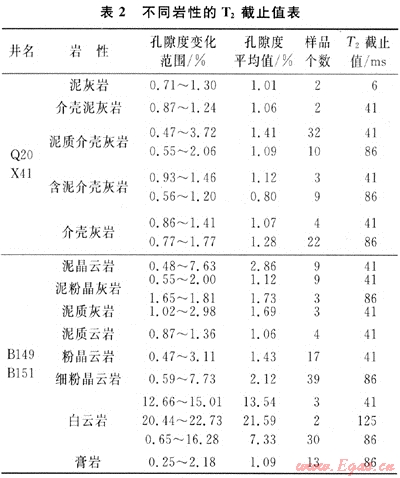 通過對216塊巖樣的T2截止值實驗,結(jié)果表明:孔隙度大小對R截止值影響沒有明顯的規(guī)律,泥質(zhì)含量高低與T2截止值有一定的統(tǒng)計規(guī)律,一般情況下,泥質(zhì)含量高的碳酸鹽巖的T2截止值一般較小(表2),普遍在41ms左右;而泥質(zhì)含量低,巖性較純的碳酸鹽巖的T2截止值普遍較泥質(zhì)含量高的巖樣的T2截止值高,在86ms左右。因此碳酸鹽巖地層核磁共振測井的T2截止值不應(yīng)是定值,它與泥質(zhì)含量成反比關(guān)系[6]。