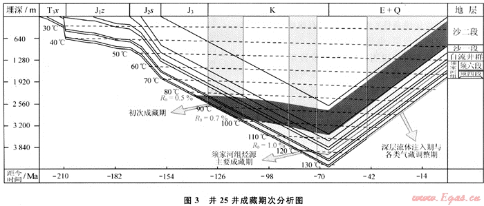 與筆者所恢復的井25井古地溫梯度和埋藏史及生烴史對照,可得到井25井成藏期次分析圖(圖3)。由圖2可知,在古地溫為90℃左右時,須家河組處于白堊系地層沉積初期,此階段須家河組烴源巖成熟度Ro為0.5%~0.7%,為生烴早期階段,煤系烴源巖以生成部分液態(tài)烴和濕氣為主,屬于低演化系列烴類,絕對數(shù)量有限,但可優(yōu)先占據(jù)儲層原生孔隙,且因儲層巖石沒有完全壓實而物性較好,利于烴類高效運聚,為初次成藏期。第二階段均一溫度為115~125℃,對應白堊系地層沉積后期,烴源巖成熟度(Ro)為0.9%~1.0%以上,進入須家河組生烴高峰期。由于樣品包裹體分布不均等因素,使得在分析的樣品中所測得的該期包裹體均一溫度數(shù)量不多,但這是須家河組烴源巖大量生烴階段,以生成煤成氣為主,氣體干濕度適中并含少量凝析油。因此應屬于須家河組烴源的主要成藏期。