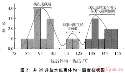 井25井須家河組儲層兩種鹽度值反映存在2種烴源產(chǎn)物,其中第一種較低鹽度(NaCl質(zhì)量分數(shù)為6.6%~8.0%)對應較高的均一溫度范圍(115~150℃),應為演化程度較高的油氣所伴生;第二種較高的撲度(NaCl質(zhì)量分數(shù)為21.8%~22.1%)和較低均一溫度范圍(82~102℃),是剛進入大量生烴階段的產(chǎn)物(表1)。統(tǒng)計井25井須家河組儲層與烴類包裹體伴生的鹽水包裹體均一溫度,繪制包裹體均一溫度柱狀圖(圖2),可見均一溫度存在3個主要峰溫,對應3個溫度范圍:90~105℃、115~125℃以及130~155℃。