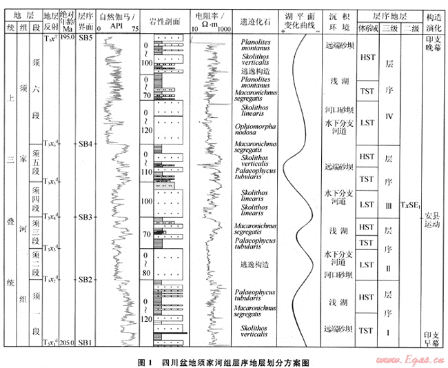 綜合地震、測井、鉆井和野外露頭資料,將須家河組劃分為4個三級層序,每個層序可進(jìn)一步識別出低位、水進(jìn)和高位3個體系域。層序Ⅰ對應(yīng)于須家河組一段(須一段),層序Ⅱ?qū)?yīng)于須二段和須三段,層序Ⅲ對應(yīng)于須四段和須五段,層序Ⅳ對應(yīng)于須六段(圖1)。