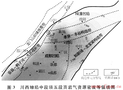 采用網(wǎng)格剖分法可對(duì)研究區(qū)得資源量進(jìn)行平面上的微元分析,即根據(jù)各微元的頁(yè)巖厚度、頁(yè)巖含氣量(頁(yè)巖中的氣體吸附率按50%[22]計(jì)算)、巖石密度以及總有機(jī)碳含量等,可對(duì)研究區(qū)內(nèi)須五段的頁(yè)巖氣資源密度進(jìn)行平面計(jì)算,進(jìn)一步通過(guò)微元積分法亦可得研究區(qū)頁(yè)巖氣資源總量。以川西坳陷中段為例(圖3),資源密度等值線(xiàn)高值主要集中在新場(chǎng)德陽(yáng)-廣漢-新都-溫江-大邑一線(xiàn)的成都凹陷,表明該區(qū)可作為頁(yè)巖氣進(jìn)一步勘探研究的有利目標(biāo)區(qū)。