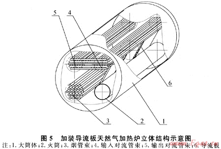 為加強天然氣加熱爐大筒體內(nèi)有效傳熱流場的組織,提出一種大筒體內(nèi)加裝導流板組織熱流場的改良結(jié)構(gòu)(國家發(fā)明專利:ZL200810036446.4):在筒體上部的冷卻受熱面和筒體下部的加熱受熱面之間,沿簡體軸向設(shè)置導流板,導流板的長度可按實際需要沿筒體軸向分割成幾塊,這樣便于加工安裝和提高使用效果,如圖5所示。
