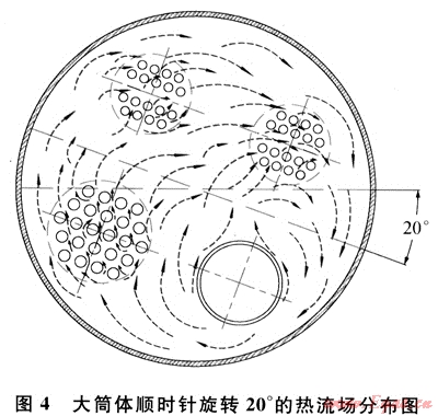 針對天然氣加熱爐大筒體內(nèi)無法形成有效傳熱流場的缺點,首先提出一種旋轉(zhuǎn)型圓筒式天然氣加熱爐(國家實用新型專利:ZL200820057571.9):將大筒體內(nèi)對稱布置的加熱受熱面(即火筒和煙管束,以及冷卻受熱面)旋轉(zhuǎn)適當?shù)慕嵌?,使加熱受熱面盡可能置于較低的位置[8](如圖4所示),這時大筒體內(nèi)溫度最高的火筒位于筒體的最下部,形成一股較強向上的熱壓,增大引起自然對流的動力,由于火筒、煙管束和對流管束內(nèi)的流體存在溫差,促使大簡體內(nèi)中間載熱介質(zhì)形成順時針循環(huán)順暢的熱流場,消除大筒體底部的“死角”,達到強化傳熱,提高效率的目的。研究表明:該旋轉(zhuǎn)角度以20°為最佳[9],旋轉(zhuǎn)太小,達不到增大動力的目的;旋轉(zhuǎn)太大,會導致煙管束與輸入對流管束處于同一水平位置,反而破壞了順暢流場的形成。