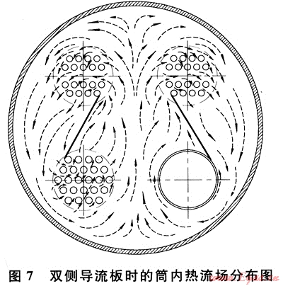 實際應(yīng)用中,亦可布置雙側(cè)導流板(圖7),火筒和煙管束周圍的上升流在雙導流板的引導下,分別流經(jīng)各自上方的對流管束放熱后,向下回流到火筒和煙管束附近,從而在大筒體內(nèi)形成了更有效的雙循環(huán)流場。