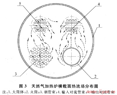 所有這些因素都不利于有效傳熱流場的形成,使加熱和冷卻受熱面的有效利用降低,造成筒體內(nèi)傳熱流場組織紊亂,從而使天然氣加熱爐效率低、能耗高。顯然,中間載熱介質(zhì)傳熱過程的形成,亦即大容積簡體內(nèi)流場的組織是提高天然氣加熱爐效率的關(guān)鍵點之一。
