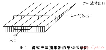 大型的液塞捕集器通常用一些標準管段來制造,即管式液塞捕集器,其儲存段由許多傾斜的平行管組成(圖1)。管式液塞捕集器主要包括兩部分[1]:①入口分離部分,用于氣液分離;②儲液部分,是一組平行下傾管段,用于貯存液體,常由標準直徑的管段制造。