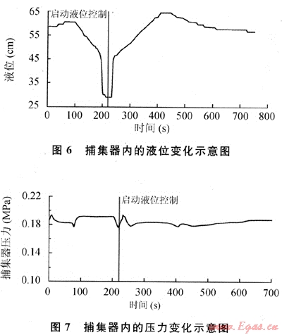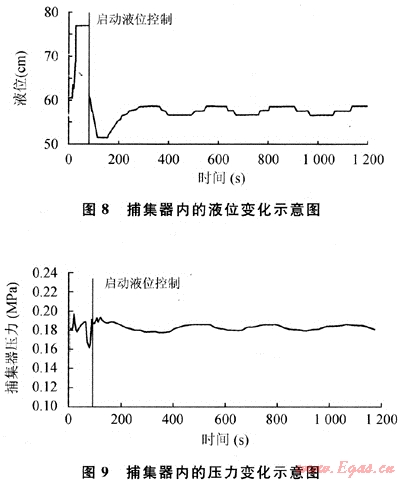 由圖6、7可知,在這一工況中,液位控制系統(tǒng)啟動前,捕集器內液位會慢慢降低,直至最低,在液位低于30cm時,就會有大量氣體從捕集器液體出口溢出,導致捕集器內壓力不穩(wěn)定。液位控制系統(tǒng)啟動后,液位先增高然后逐漸達到穩(wěn)定工況,捕集器內壓力也趨于平穩(wěn),沒有大幅度的上升或降低。