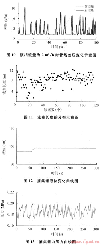 由圖12、13可以看出,在實驗工況下,捕集器內液位能保持穩(wěn)定,而捕集器內的壓力隨著較大段塞的進入有所波動,這與間歇通入氣體有關,但波動不大,基本在0.18MPa左右。由此可知捕集器在較大長度液塞工況下運行穩(wěn)定。