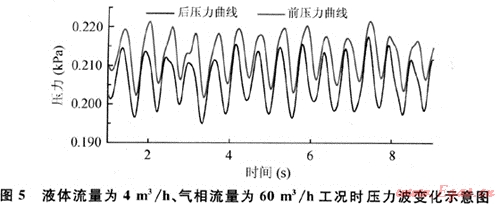 利用高速數(shù)據(jù)采集系統(tǒng)Lab-View,在實驗環(huán)道上可完成段塞頻率和壓力波動幅度測試,圖6為氣相流量為60m3/h、液相流量為4m3/h時由測壓點測得的壓力隨時間的變化圖(以該工況為例說明管式液塞捕集器的工作性能)。從圖5看出,在8s內出現(xiàn)了14個不同的段塞,并可確定段塞周期、頻率、段塞長度以及段塞流動時壓力變化情況。