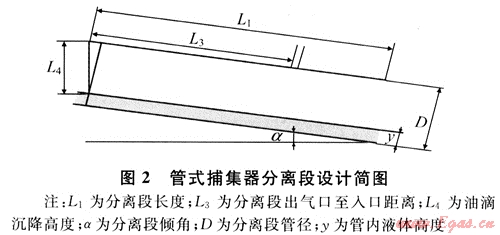 按照從氣體中分離出液滴的要求,計算得出氣體出口的位置L3,按照規(guī)定的比例關系,計算得到捕集器分離段的管長L1。改變傾角的值,重復計算得到最優(yōu)的傾角、管徑、管長值。