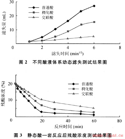 針對普通酸、稠化酸、交聯酸三種酸液體系分別進行了反應動力學行為測試、酸液濾失性測試及60℃恒溫水浴靜態(tài)酸-巖反應測試,結果表明(見表1及圖2、3):氫離子傳質系數越低,反應速率越慢,則酸液控濾失效果越好(濾失量越少),酸-巖反應后的殘酸濃度就越高。文中交聯酸酸液體系顯示了良好的控濾失性能。