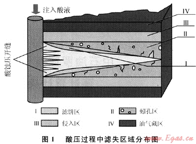 由于蚓孔地層的濾失,降低了酸液實際有效作用距離,增加的注液量僅對近井帶的儲層改造,最終導致增產效果不理想。因此,實際酸壓過程中酸液的濾失主要包括裂縫壁面向基質的濾失和酸蝕蚓孔濾失兩部分[6],并且細分為4個區(qū)域(圖1)。其中,酸液濾失主要受到蚓孔區(qū)(Ⅱ)內蚓孔擴展速度及侵入區(qū)(Ⅲ)內與流動剪切及裂縫溫度有關的酸液黏度所控制。另外,地層一旦形成蚓孔,酸液濾失則主要在蚓孔內發(fā)生,濾失量由蚓孔擴展體積和酸液向酸蝕螞孔壁面濾失量共同決定。