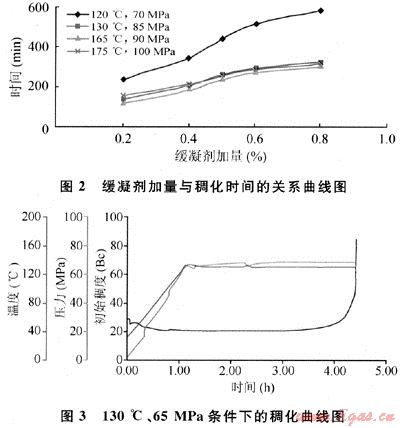 高溫緩凝劑WHJ對水泥漿稠化時(shí)間的影響實(shí)驗(yàn)結(jié)果見圖2、圖3。