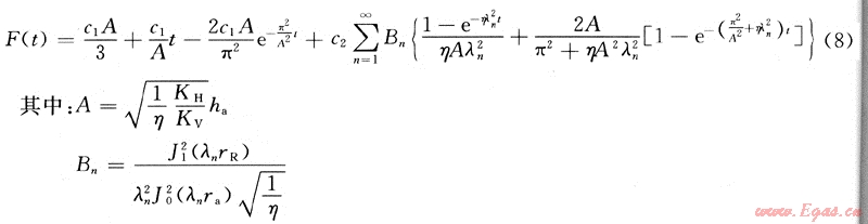 △p為壓降,MPa;pai為水層原始地層壓力,MPa;△pv為變壓降,MPa;η為水層擴散常數(shù);r為徑向空間變量,m;z為垂向空間變量,m;KV為水層垂向滲透率,10-3μm2;KH為水層水平方向滲透率,10-3μm2;t為時間,mort;φa為水層孔隙度,小數(shù);μw為地下水黏度,mPa·s;cea為水體有效壓縮系數(shù),MPa-1;ha為水體厚度,m;qx為氣水界面處定流量,m3/mon;qv為氣水界面處變流量,m3/mon;rR為氣層半徑,m;ra為水層半徑,m;We為累計水侵量,m3。