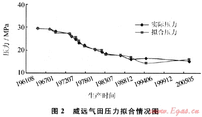 根據(jù)計算得到的儲量值,可得到威遠(yuǎn)氣田最優(yōu)擬合數(shù)據(jù)及壓力擬合情況(圖2、表2)。