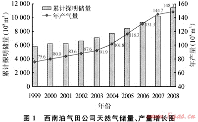川渝地區(qū)天然氣工業(yè)始于20世紀50年代。1999年中國石油重組改制并在境外上市,西南油氣田公司(以下簡稱公司)負責川渝地區(qū)天然氣勘探開發(fā)業(yè)務。經(jīng)過10年(1999~2009年)的艱苦奮斗,天然氣勘探屢獲重大突破,儲量快速增長,天然氣開發(fā)成果卓著。新建產(chǎn)能120×108m3/a(超過過去20年的建設(shè)總量),地面輸配氣能力達200×108m3/a,天然氣凈化能力達146×108m3/a,2004年天然氣產(chǎn)量突破100×108m3,2006年油氣當量突破一千萬噸大關(guān),成為國內(nèi)首個以天然氣生產(chǎn)為主的千萬噸級大油氣田。天然氣產(chǎn)量從1999年的75×108m3上升到2008年148×108m3,翻了近一番,年均增長10%(如圖1)。10年累計生產(chǎn)天然氣1060×108m3,占近50年總計產(chǎn)量的39%,天然氣開發(fā)實現(xiàn)了跨越式大發(fā)展。