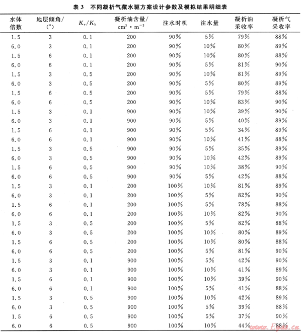 在前面凝析氣藏水驅(qū)方案確定之后,利用Eclipse數(shù)值模擬軟件的組分模擬器E300對其進行了模擬運算,其結(jié)果見表3。