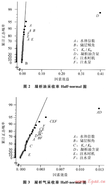 Half-normal圖的橫坐標代表各因素在兩水平之間變化時引起的相應(yīng)凝析油氣指標平均值的變化,縱坐標代表累計概率。如果某因素從低到高變化時引起評價指標的減少,那么其影響是負面的;反之如果引起評價指標增大則說明其作用是正面的。該圖主要由代表不同因素和不同因素交互作用的點與一條通過大多數(shù)點的直線構(gòu)成。由代表不同因素的點偏離直線的程度可以看出其所對應(yīng)的指標影響的重要性程度,由左到右偏離的越多影響越重要。