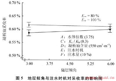 圖2為本次研究給定的氣藏條件和流體性質(zhì)情況下6個因素中對于凝析油的采收率指標的Half-normal圖件,由它可以看出對于凝析油采收率不同因素影響的重要性程度由高到低依次為:凝析油含量、底水的體積、底水體積與地層傾角的交互作用、注水量、注入時機等。
