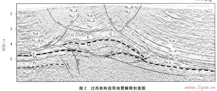 庫(kù)車(chē)地區(qū)的勘探實(shí)踐表明,膏鹽層塑性增厚部位往往發(fā)育在地表背斜的核部,鹽下背斜通常位于地表背斜的翼部或者地表向斜以下,無(wú)論克拉蘇構(gòu)造帶還是東秋迪那構(gòu)造帶都具備這樣一個(gè)特征。大宛齊鹽拱實(shí)際上是喀桑托開(kāi)背斜向西的延伸部分,并非特殊,這和秋參1井以南的鹽拱是一個(gè)模式。西秋構(gòu)造帶的構(gòu)造樣式和克拉蘇及東秋迪那構(gòu)造帶非常接近,過(guò)東秋6井和迪那3井的地震剖面鹽下構(gòu)造形態(tài)與西秋構(gòu)造帶有較強(qiáng)的類(lèi)似性,北翼也有反沖斷層。而北翼的反沖斷層正是造成西秋構(gòu)造帶復(fù)雜性的原因之一,也正由于北翼斷裂導(dǎo)致地層重復(fù)才使核部鹽下構(gòu)造北翼的隆升,促成地表形成復(fù)背斜,這和克拉蘇構(gòu)造帶極其相似。從克拉蘇及迪那構(gòu)造帶的構(gòu)造形態(tài)不難想到西秋的鹽下地層已經(jīng)大幅度卷入隆升,強(qiáng)波組反射正是鹽下古近系砂泥巖和中生界的反映。這表明南、北秋里塔格之間的中部戈壁區(qū)以下發(fā)育有大型鹽下構(gòu)造圈閉,有望成為新的勘探靶區(qū)。